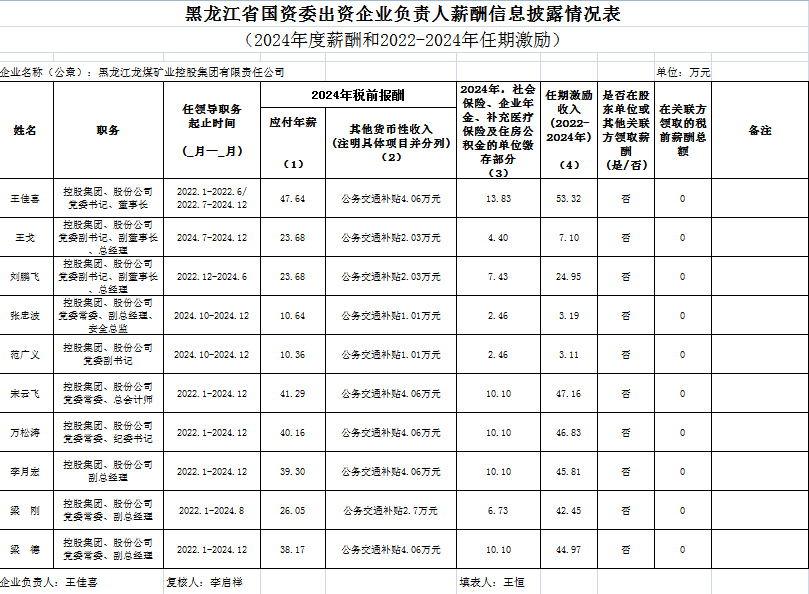 黑龙江省国资委出资企业负责人薪酬信息披露情况表(2024年度薪酬和2022-2024年任期激励)